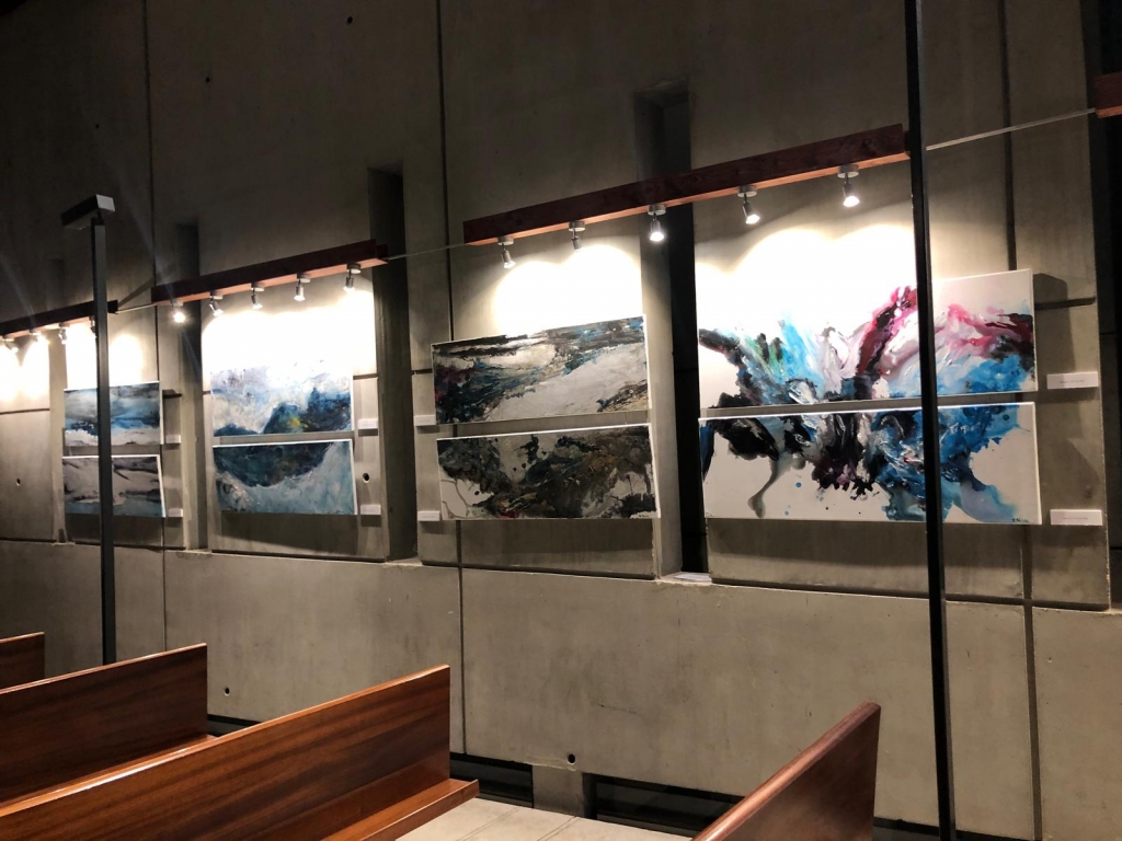En fait, cette exposition s’est construite à partir en premier lieu d’une longue série sur l’eau avec des petits formats, lieux d’une ivresse de l’eau que j’ai tenté de transmettre. L’art comme lieu d’ « accomplissement existentiel d’approbation, de bénédiction et de la vie, comme dirait Nietzsche. En second lieu, d’un travail de théologiens des arts, 3 années à chercher ce que l’ont peut dire des regards des artistes contemporains et des théologiens sur le motif des eaux et à partir cette réflexion et de ligne proposé par le père Courtes, j’ai produit cette série de 8 tableaux, ces 4 diptyques réalisés pour cette exposition.J’ai mis en parallèle deux grandes œuvres qui ont construit mon parcours artistique mais jamais mis l’une à côté de l’autre : chemin de vie, chemin de foi suite à une commande du CCFD et le radeau de la miséricorde pour le dernier jubilé. Mon rôle d’artiste » est d’aider à sortir, l’enfermement du regard par un travail de « re symbolisation » (Didi Huberman), à partir de « l’expression sensible » par le sens pour toucher les sens. Est- ce que j’ai réussie ?